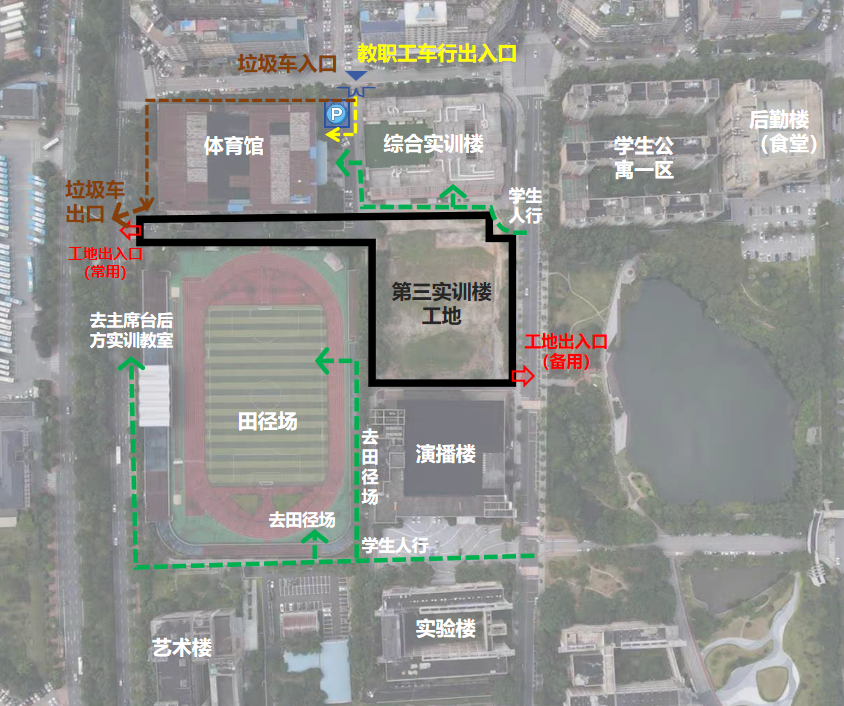 学校第三实训楼已进场做施工前期准备工作,根据上级部门质安监及学校工地建设相关安全管理要求,工地建设期间必须100%全封闭施工。根据学校实际情况,该建设工地将阻断从演播楼方向由南向北前往综合实训楼、体育馆的路线,届时教师车辆需通过灰埠路北侧出入口前往体育馆、综合实训楼,师生步行需在板仓路靠近综合实训楼的新开铁门进入体育馆、综合实训楼;进入田径场的原路线(田径场东侧,演播楼对面)维持不变,额外扩大田径场南侧出入口方便师生通行。具体路线见下图所示: